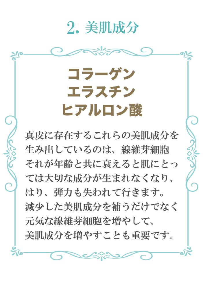 肌の再生に関与する成長因子、主にEGF・FGF・VEGF・IGF・HGF・TGF-βが含まれています。